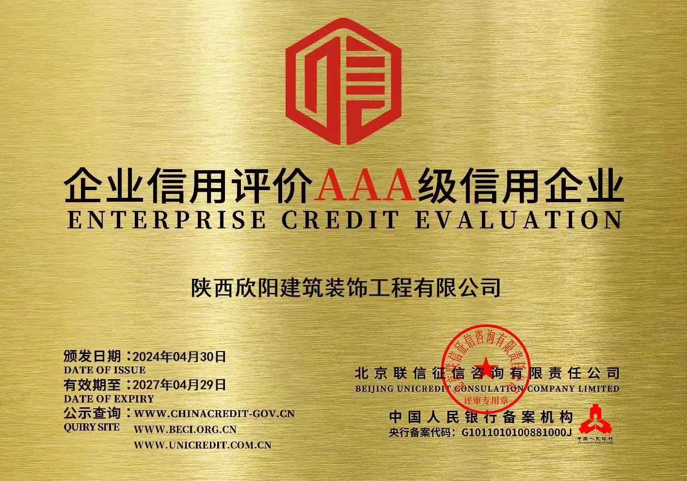 喜訊!我公司榮獲企業(yè)信用評價AAA級信用企業(yè)等榮譽(yù)認(rèn)證 近日,我公司榮獲中國人民銀行備案機(jī)構(gòu)-北京聯(lián)信征信咨詢有限公司頒發(fā)的企業(yè)信用評價AAA級信用企...